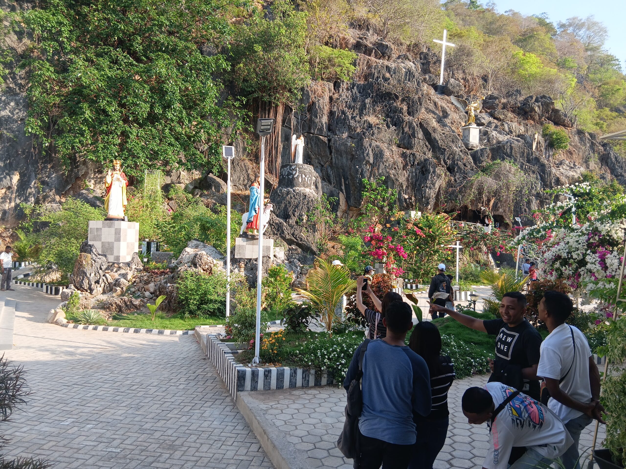 Disana, terbangun Patung Yesus Kristus dan Bunda Maria dibagian pelataran dengan hiasan bunga berwarna-warni. Yang lebih menarik, ada juga patung Bunda Maria dalam gua batu yang menjadi tempat orang berdoa. Setelah Gua Maria, pengunjung bisa memasuki gua batu sekira 10 meter. Disana terdapat Patung Yesus Kristus dengan diwarnai pernak pernik lampu hias.